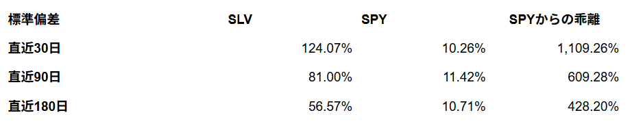 一方で、この金融商品は非常に高いボラティリティを持ちます。SLV の標準偏差の直近30日では124.07%、それに比べ