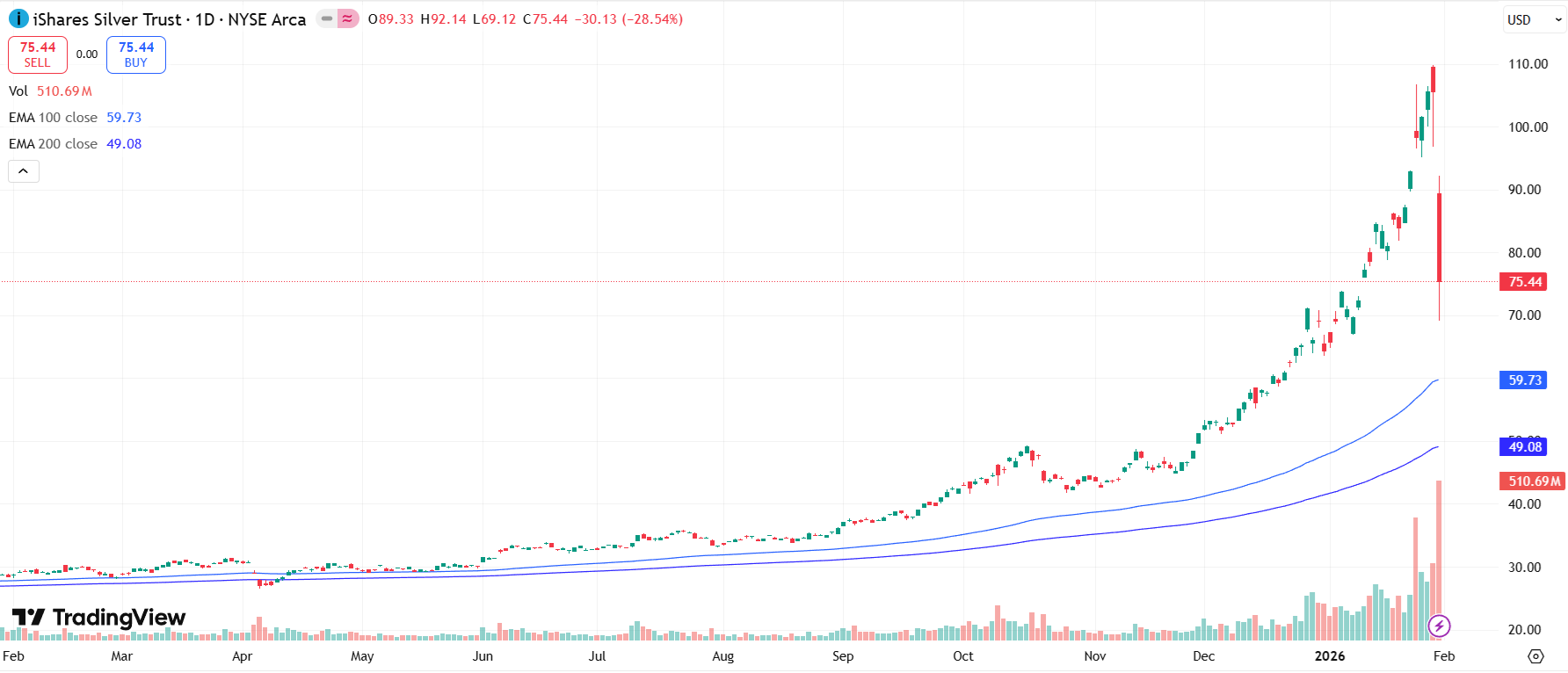 テクニカルな観点から見ると、SLVは他のシルバーETFの銘柄と比べて極端に乖離しているわけではありません。ただし、現在のSLV価格は200日指数平滑移動平均線(EMA)を53.7%上回っており、100日EMAも26.3%上回っています。これは、このETFが「買われ過ぎ」や「強いモメンタム相場」であることを示唆していますが、これらのテクニカル要因は投資家によってポジティブにもネガティブにも捉えられます。もしポジティブに捉えれば、一貫した資金フローによって支えられていると見ることができますし、ネガティブに捉えれば、投機的な資金フローによる一過性の価格変動であると見ることもできるでしょう。