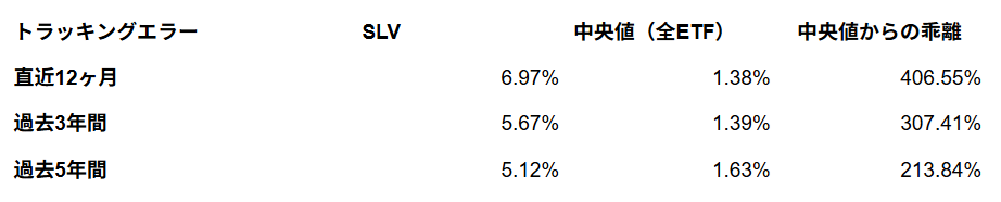 すべての投資期間(直近12ヶ月、3年、5年)において、SLVのトラッキング・エラーはETFの中央値の2倍を超え、多いときには、ほぼ3倍に達しています。平たく言えば、銀価格が動いても、SLVは必ずしもそれに密接かつ期待通りに連動してくれるとは限らない、ということです。この原因はファンドの構造的なものであり、保管手数料、運用上の非効率性、買気配と売気配のスプレッドのゆがみ、そしておそらく最も厄介なのは、高度に金融化された市場環境の中で現物裏付け型ファンドを時価評価するという特有の仕組みそのものにあります。